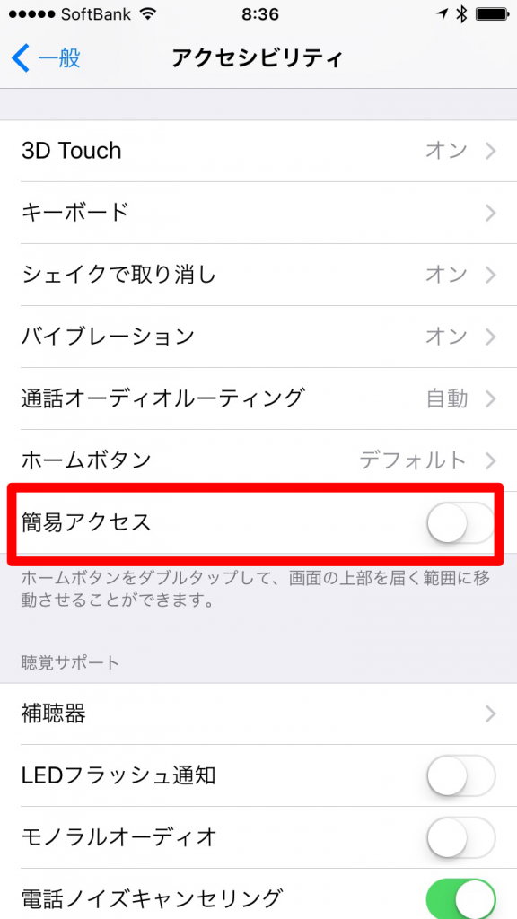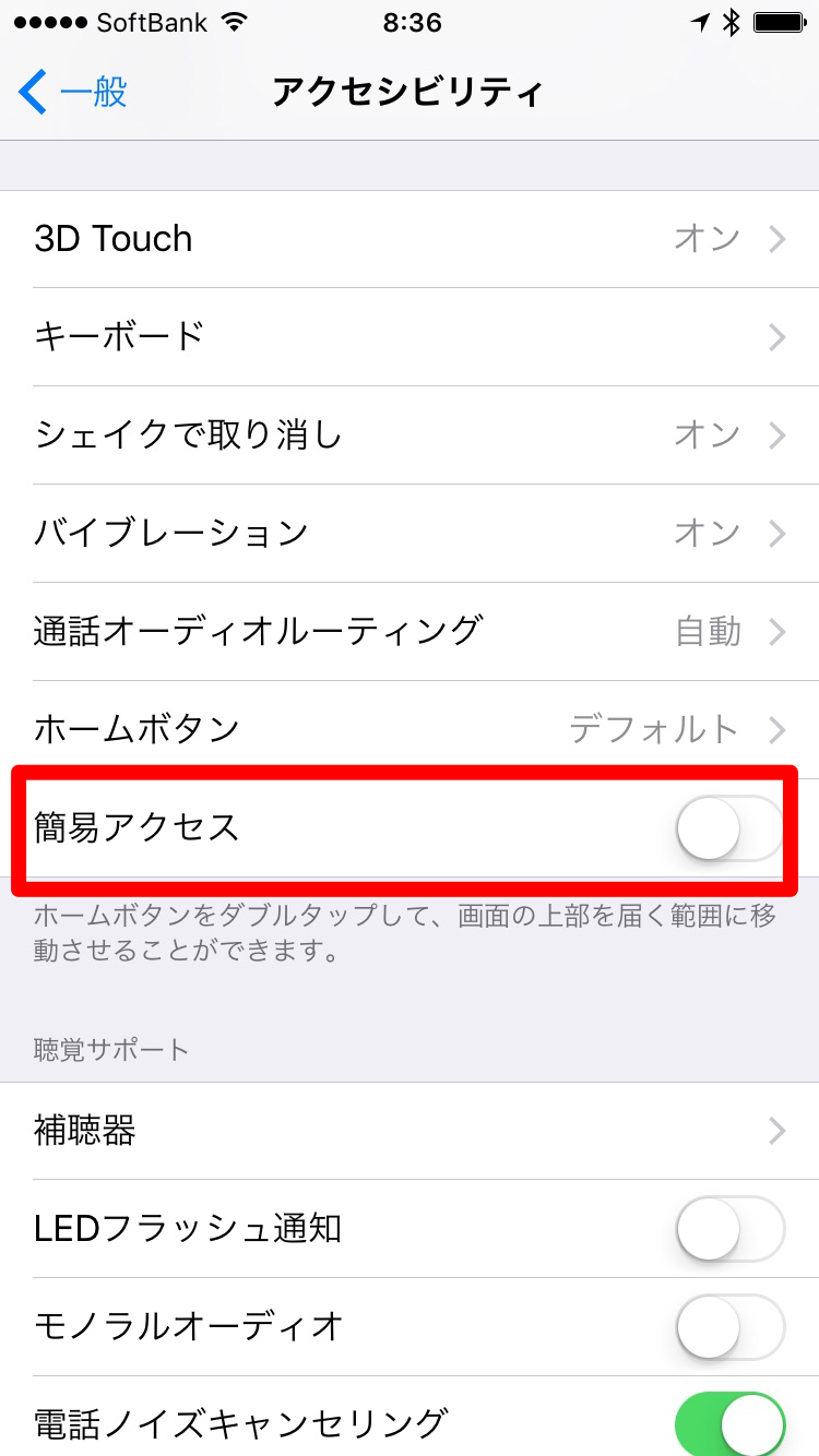5 「簡易アクセス」を見つけたら、その項目のスイッチをタップすると切り替えて完了です。