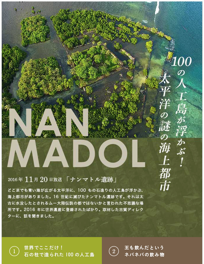 さて、今年の7月に世界遺産に登録されたばかりのムー大陸の記事を書きました。正確にはナンマトル遺跡(ナン・マドール遺跡)の記事です。TBSの人気ドキュメンタリー『世界遺産』の特集ページで、担当した古賀ディレクターのインタビューが掲載されています。