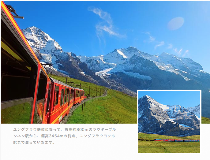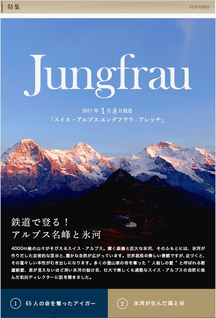 スイス・アルプスの3つの名峰と、そこに流れるアレッチ氷河が今回の主役です。