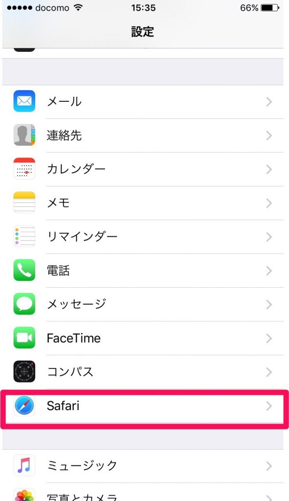 まず、「設定」アプリを立ち上げて、「Safari」の項目をタップします。