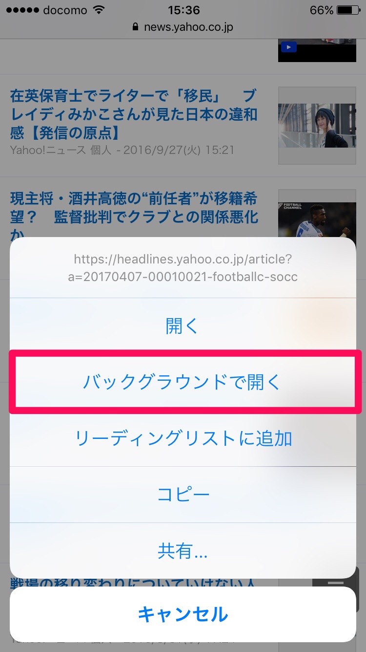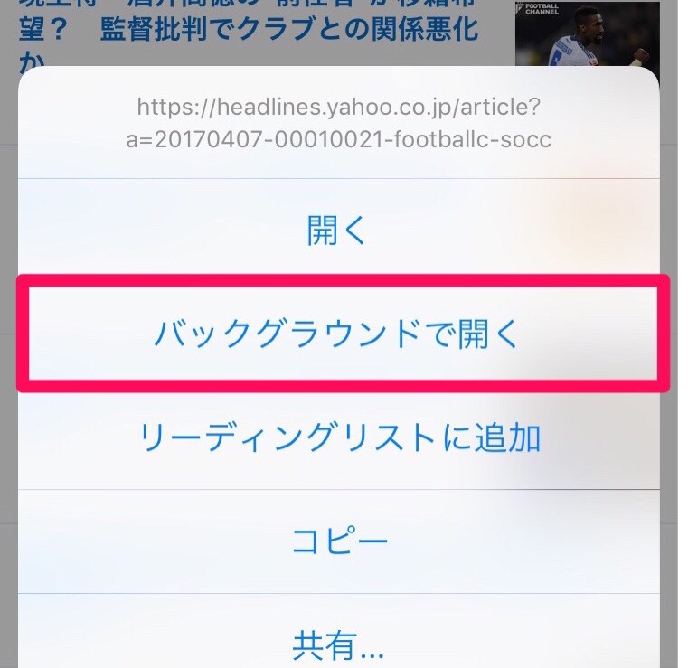 Safariで適当に見たい記事のリンクを長押しして、「バックグラウンドで開く」をタップしてみましょう。