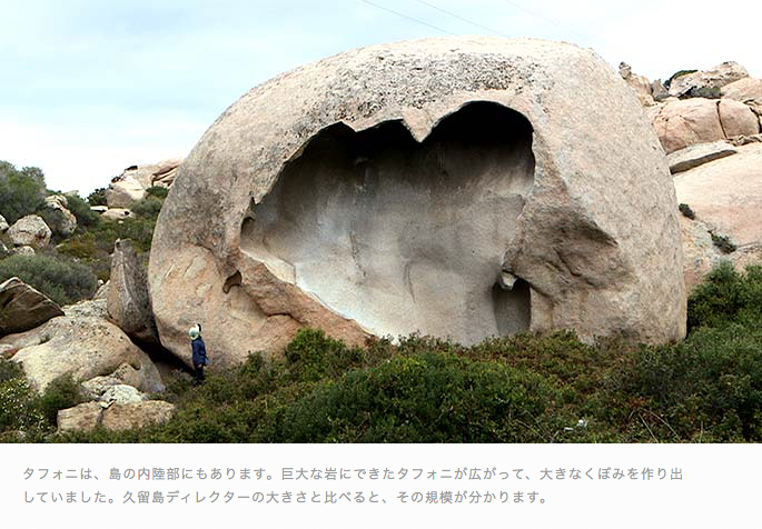 この穴、潮風に乗って飛んできた塩分がコツコツと掘っていった穴なのだそうです。タフォニができているのは、硬い硬い花崗岩。中には巨大な穴になっている所もあって、要するにそれはまあ、長い長い年月をかけて形作られてきたわけです。