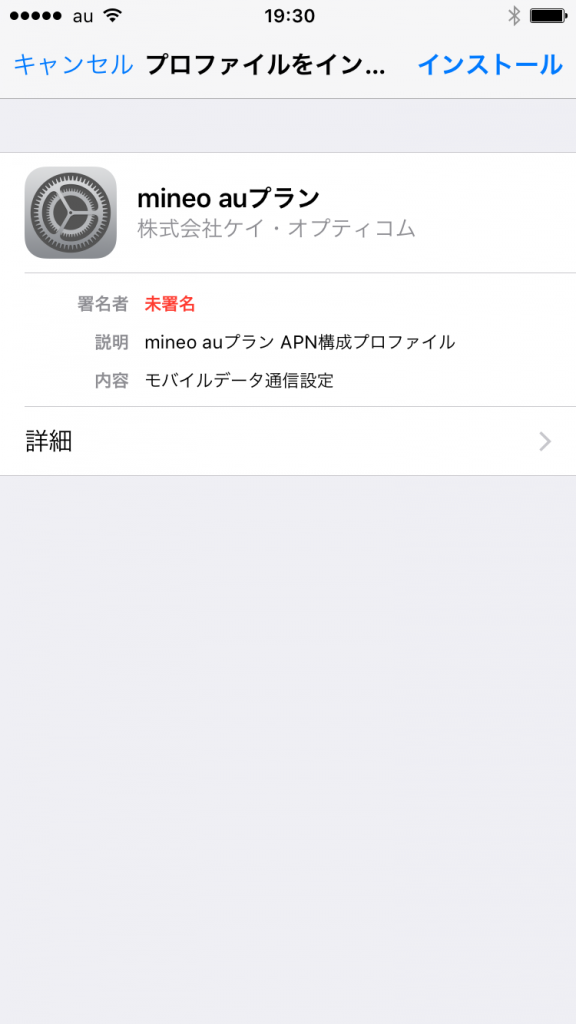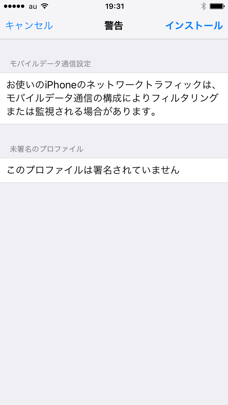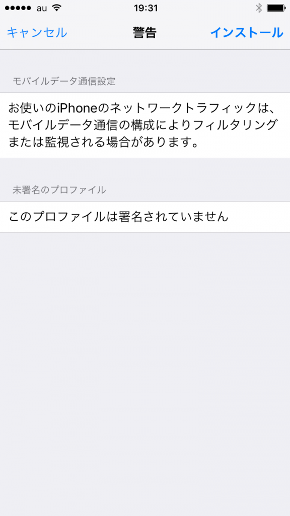 リンクをタップするとプロファイルのインストールが始まります。パスコードを入力して手順を進めます。